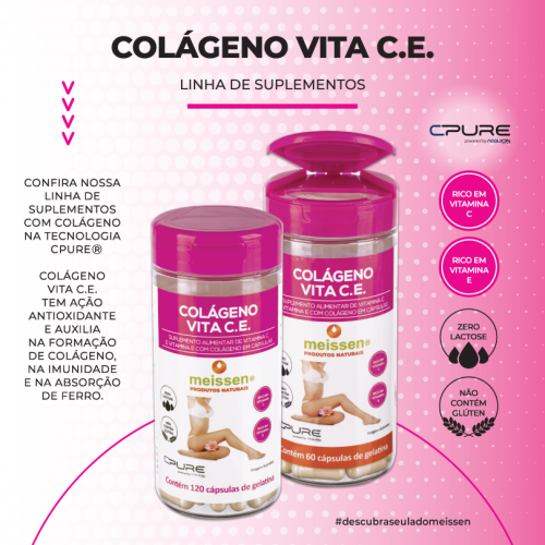Ingredientes: Colágeno hidrolisado, Vitamina C, Vitamina E e cápsula (gelatina e água purificada).