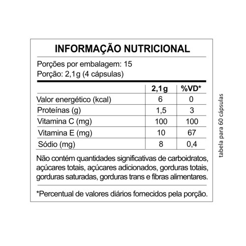 Ingredientes: Colágeno hidrolisado, Vitamina C, Vitamina E e cápsula (gelatina e água purificada).
